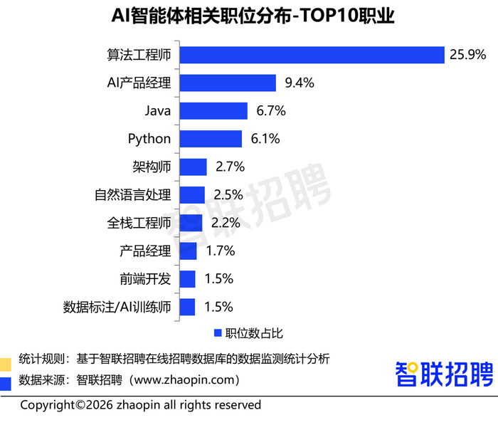 智联招聘《2026年春招市场行情周报(第三期)》显示,节后前三周,AI智能体相关职位数同比增速高达455%;技术研发类岗位仍是核心需求,算法工程师职位数占比25.9%,需求最为突出;AI产品经理占比9.4%紧随其后,Java、Python等编程与开发岗位均超过6%。这些岗位主要集中在AI智能体底层开发、系统架构、交互设计和应用部署等环节,进一步印证当前阶段企业迫切需要的,是具备工程实现能力的开发类人才。