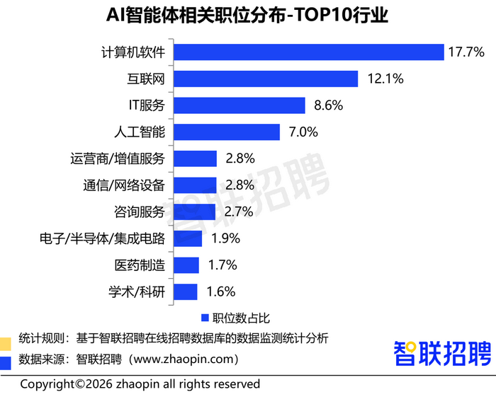 行业需求也在不断扩散。计算机软件行业职位数占比17.7%,位列榜首;互联网、IT服务和人工智能行业职位占比分别为12.1%、8.6%、7%。与此同时,医药制造、学术/科研等领域也开始引入智能体技术,用于药物研发数据分析和科研文献处理等场景。