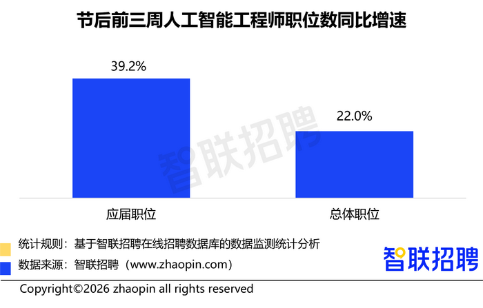 智联招聘节后前三周数据显示,2026年春招市场中,面向应届生的人工智能工程师职位数同比增长39.2%,明显高于面向整体的22%增速,说明企业对AI领域应届生的需求正在加速释放。应届人工智能工程师平均招聘月薪达到17038元,具有吸引力。