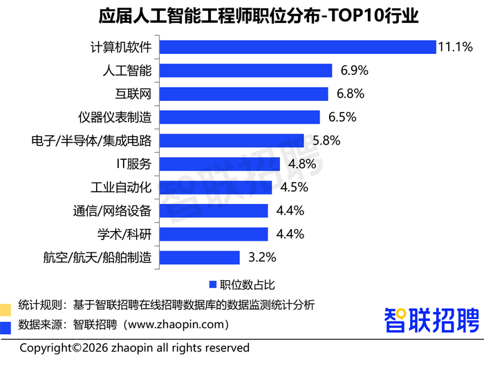 从行业需求看,多个行业正向AI应届生敞开大门。计算机软件行业应届AI工程师需求占比11.1%,成最大需求方。人工智能、互联网、仪器仪表制造、电子/半导体/集成电路等行业对AI应届生也在释放需求,持续扩招。