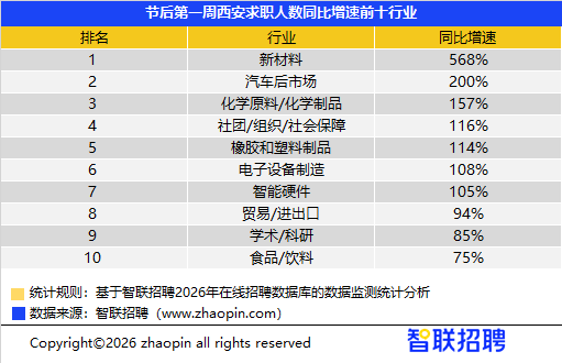 从求职趋势看,求职者对新质产业的热度同样与需求端形成呼应。2026年春节后首周,求职增速TOP4赛道均被新质产业包揽,其中汽车智能互联行业以168.9%的求职人数同比增速遥遥领先,光电子行业、机器人、新材料行业紧随其后,增速分别达121.0%、110.6%、97.0%,足见新质产业对人才的吸引力大大提升。