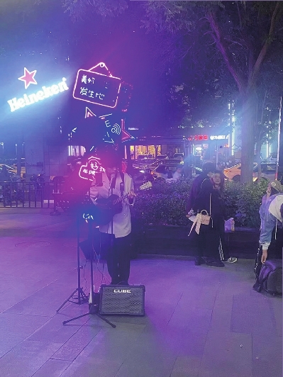 “小姐姐”唱完,伦伦弹奏吉他,一边演唱,一边用手机直播,与粉丝互动。“一般从晚上6时演唱到晚10时。收入包括现场演唱和直播间听众的‘打赏’。”伦伦介绍。疫情过后,这里的人流量正在恢复。听众多了,“玩票”的街头歌手也就多了。